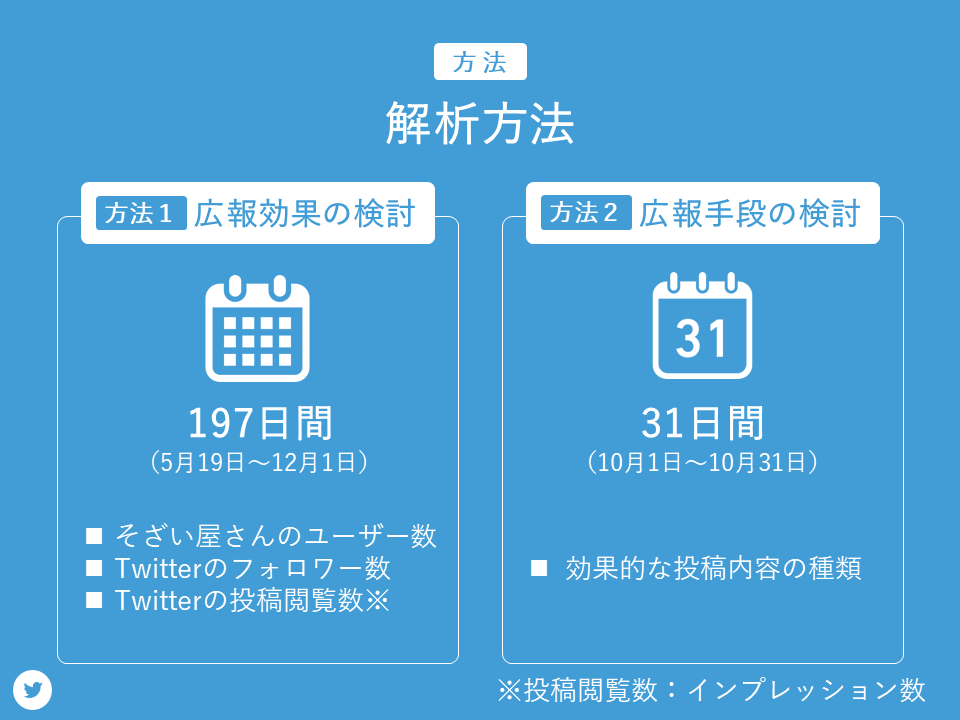 具体的な解析方法についてです。まず、1つ目の広報効果の検討では、全期間である197日間のそざい屋さんのユーザー数、Twitterのフォロワー数、投稿閲覧数を解析しました。2つ目の広報手段の検討では、期間を10月1日からの31日間とし、広報効果に効果的な投稿内容を検討しました。そのためのカテゴリーについて説明します。
