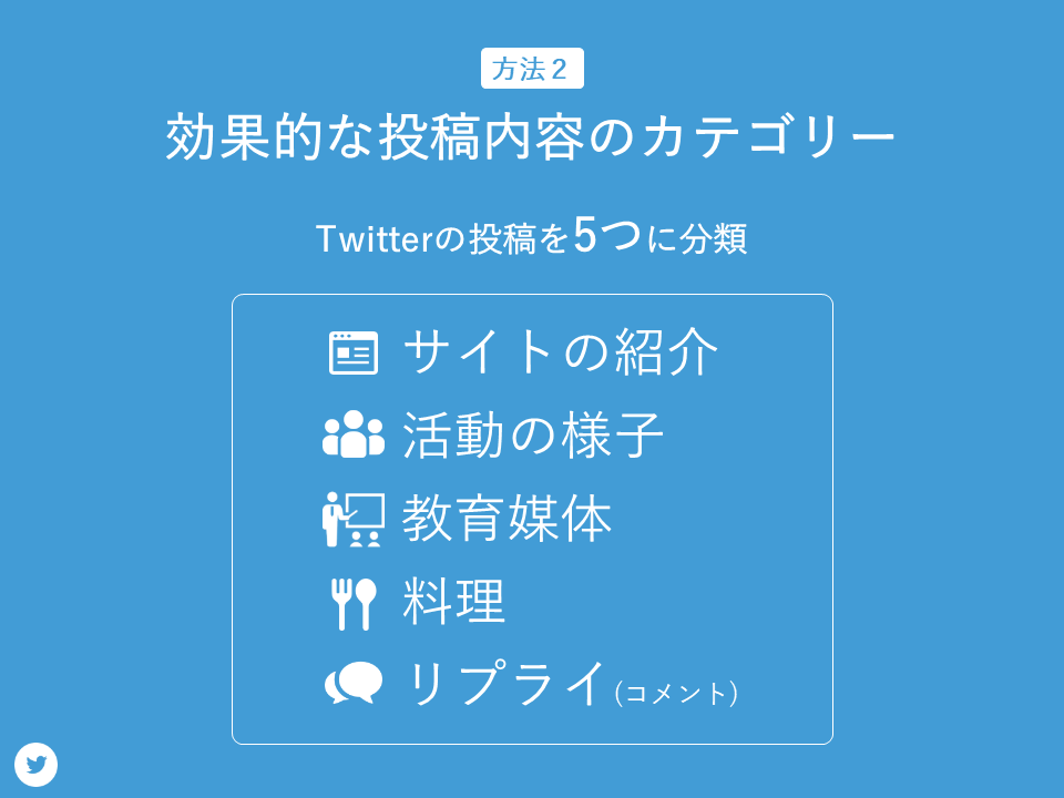 広報活動に効果的な投稿内容を探るためにTwitterの投稿を5つに分類しました。カテゴリーはサイトの紹介、研究活動の様子、教育媒体、料理、リプライに分けました。