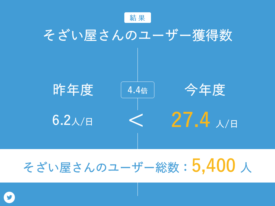そざい屋さんの1日あたりのユーザーは、昨年度は6.2人でしたが、今年度は4.4倍の27.4人のユーザーを獲得することが出来ました。全期間では5400人もの人にそざい屋さんを利用していただきました。