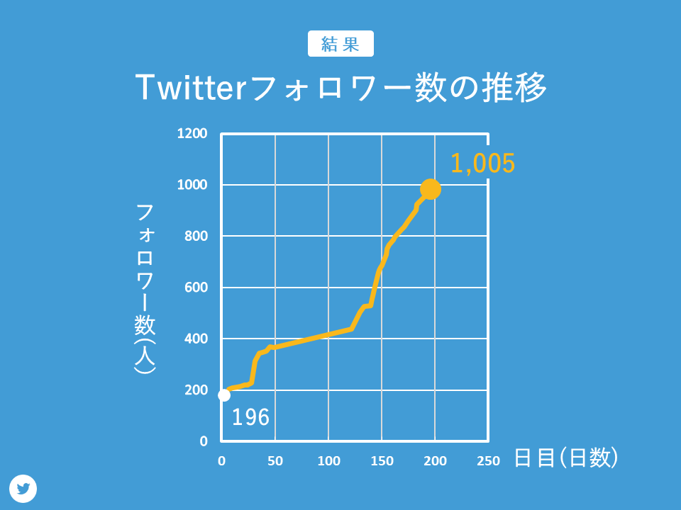Twitterのフォロワー数の推移についてです。開始時点のフォロワー数は196人でした。197日間の広報活動により1005人に増加しました。