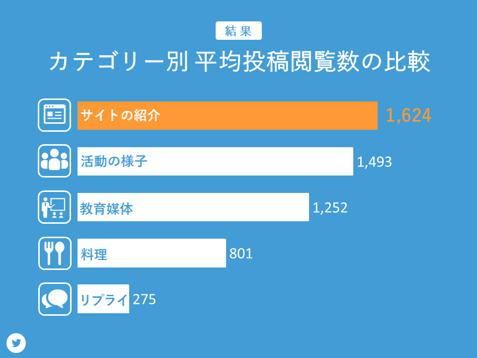 カテゴリー別のTwitterの平均投稿閲覧数の比較ではサイトの紹介が最も多かったです。次に活動の様子、教育媒体、料理、リプライという結果でした。