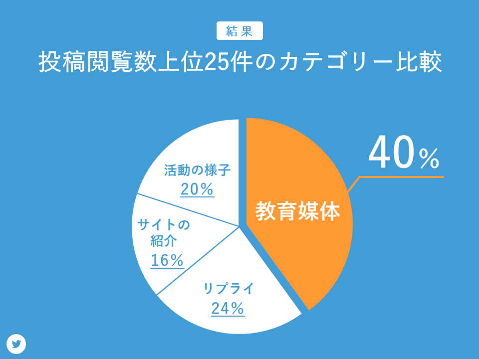 次に投稿閲覧数上位25件のカテゴリーについてまとめました。結果の通り、教育媒体が最も多く、上位25件の40%を占めていました。リプライやサイトの紹介、活動の様子は20%前後でした。