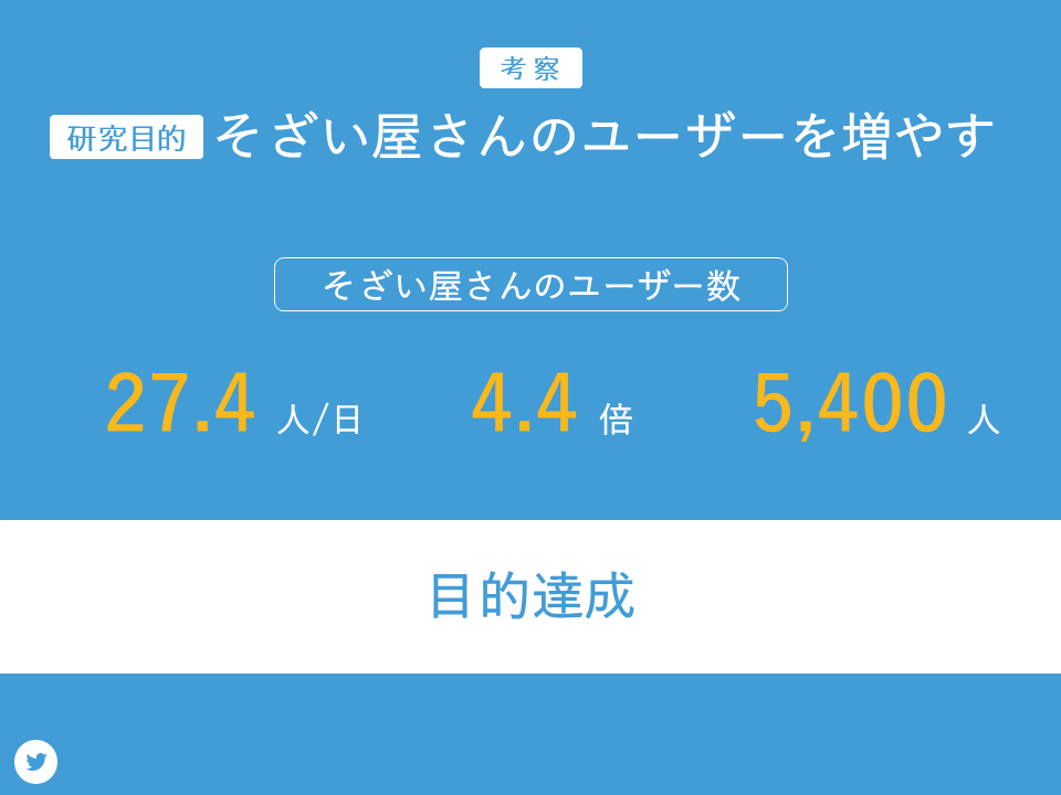 私たちはそざい屋さんのユーザーを増やすために研究を行いまいした。その結果、そざい屋さんのユーザーが1日あたり27.4人と昨年の約4.4倍に増加したこと、これは総ユーザー数5400人にあたり、研究目的を達成できたと考えられます。