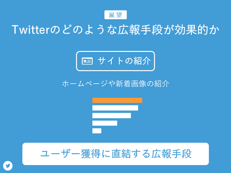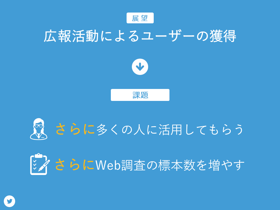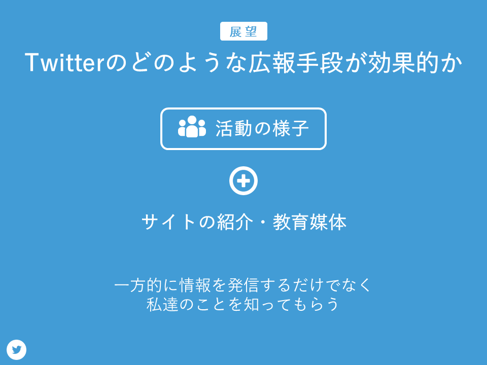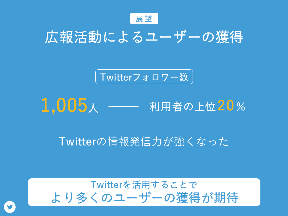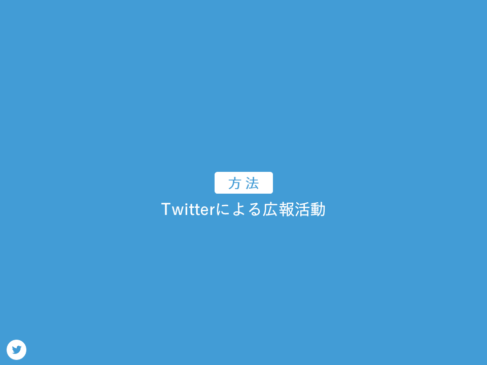 次に方法です。ユーザーを増やすためにTwitterによる広報活動を行いました。