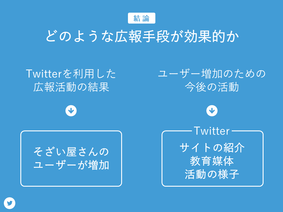 結論です。Twitterによる広報活動の結果、そざい屋さんのユーザーを4倍以上に増加させることが出来ました。今後さらにユーザーを増加させるために、私たちの広報活動により、より強力な情報発信ツールとなったTwitterを活かし、サイトの紹介や教育媒体の発信に加えて活動の様子を発信していくことが重要だと考えます。
