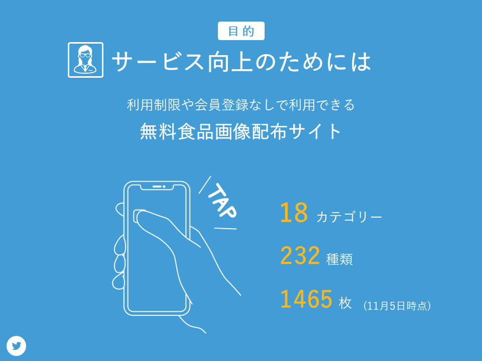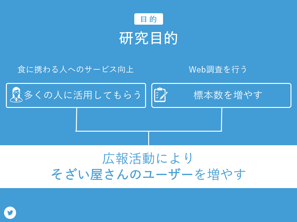 運営目的のサービス向上のためには多くの人に活用してもらうこと、Web調査を行うためには標本数を増やすことが必要です。どちらにも共通して言えることは多くのそざい屋さんのユーザーが必要であるということです。そのため広報活動によりそざい屋さんのユーザーを増やすことを目的としました。