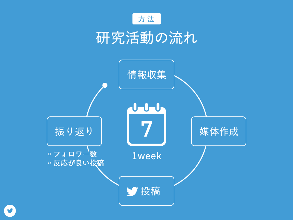 本研究活動の流れについて説明します。はじめに情報収集により、広報媒体の作成の準備をします。続いて広報媒体を作成します。そしてTwitterに投稿します。1週間投稿を続け、フォロワー増加数、反応が良かった投稿の振り返りを行い、次の週の活動内容を決定しました。